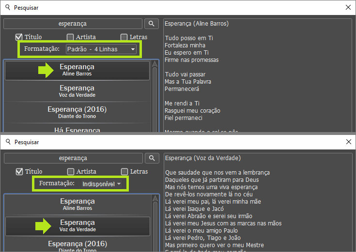If the formatting field is activated when selecting a song, it means that it has already been formatted and is suitable for display in projection.