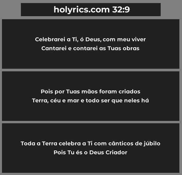Our objective is to provide lyrics with a format that is already suitable for projection, because no matter how good the editing of the lyrics is on other sites such as Letras or Vagalume, most of the time the layout is not ideal for projection: the lines are long and/or the paragraph has many lines, as well as some typos.